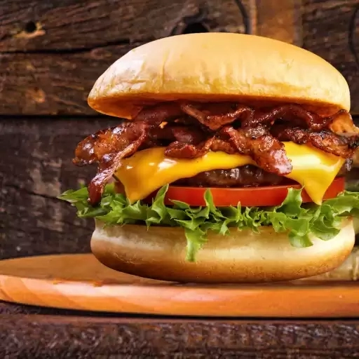 Pão, hambúrguer de carne, bacon, ovo, presunto, queijo, salada e molho especial
